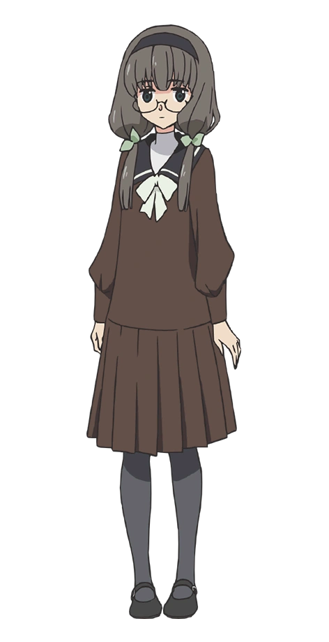 Hitoe has brown hair and eyes, her hair tied into two on each sides with green ribbon. She necessarily wears a round glasses and a dark brown hairband.